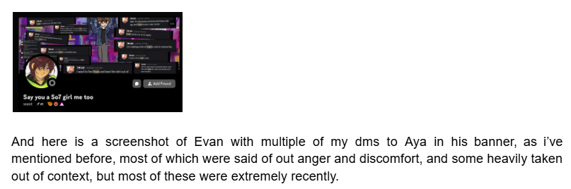 I’ll end this by saying I can always add to this if you’d like, I just get really fucked up looking at this shit. Especially the Hide Away thing I made as a joke. I don’t know. I never really talked about this when it was happening because whenever I did I’d just make fun of him with my friends. Make fun of what he was doing. But it scared me so, so much. I was so afraid. It was easier to come across as unbothered by it, but I wouldn’t have wanted to make a document or gcs dedicated to archiving a lot of this information (buried under other conversations) if it didn’t really fuck me up. I wanted this guy off my ass and I finally got a break from him until he came back. I just say this all, and not even all of my emotions, to emphasize how awful of a guy he is. I don’t care if he is a year younger than me. At 17 you know better. At 17 you know not to obsessively keep tabs on someone you don’t know, all over Gojo, and later over just Me and keeping track of My friends and My URLs that he all saved to the wayback machine btw. Making public callouts about me to spread to a community that harasses people. I did get harassment in my old strawpage about it. I privated a lot of my stuff. I don’t even use my good URLs like /gojo anymore, I gave the mc to my friend to use it. I hate this guy so much. I wish he’d fuck off. It’s the audacity to befriend specifically Cameron, you, and Ewe that gets me. Under a new identity instead of being truthful. He thinks he can just get away with it and I have to live with constant surveillance from him and other people. Cameron is fucked up over it. She isn’t fronting and that’s why it says Anonymous instead. I don’t think Ewe knows and I don’t want to contact her out of respect to leave her alone. I didn’t want to contact you until Bianca made me because she used it to try and get back at you when she has her own issues with you. She saw all the stalking and how it took a toll on me I genuinely cannot even look at JJK stuff sometimes because it remidnds me of that period of my life. And that makes me so, so upset she knows that and does this anyway and I’m not talking to her for it. Fuck her. But this isn’t about her.