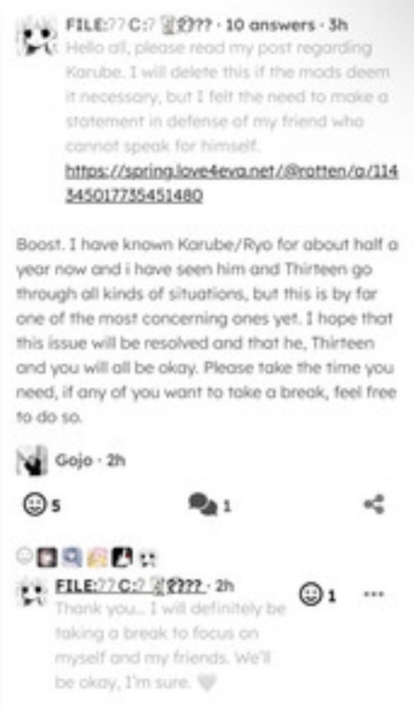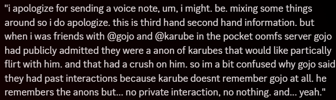 “I noticed that he defended Karube, someone exposed for being relatively inappropriate with a minor. I understand the situation has nuance but victim blaming behind the scenes is crazy when you openly supported this dude