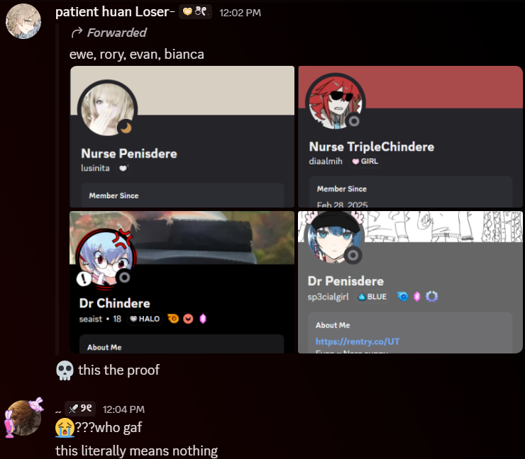 More stalking evidence I could find he seriously just stalked our Discords & social media bro and screenshotted everything. This was me making an inside joke with Bianca Ewe and Asiya